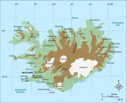 Linię brzegową Islandii o długości 4970 km przecina wiele fiordów. Przy brzegu znajduje się również większość ośrodków miejskich i osad. Centralna część wyspy, Wyżyny Islandii, to zimne i nie nadające się do zamieszkania połączenie połaci piasku, gór i pól lawy. Główne ośrodki miejskie państwa to stolica państwa Reykjavík wraz z peryferyjnymi miastami Kópavogur, Hafnarfjörður i Garðabær, Reykjanesbær, gdzie znajduje się międzynarodowe lotnisko, oraz miasto Akureyri w północnej Islandii. Wyspa Grímsey na kole podbiegunowym posiada najbardziej wysunięty na północ teren zamieszkały Islandii, podczas gdy Kolbeinsey zawiera najbardziej wysunięty na północ punkt Islandii. Na terenie państwa znajdują się trzy parki narodowe: Park Narodowy Vatnajökull, Park Narodowy Snæfellsjökull oraz Park Narodowy Þingvellir[63]. Kraj ten jest uważany za „silnego gracza” w dziedzinie ochrony środowiska, zajmując 13. miejsce w indeksie efektywności środowiskowej Uniwersytetu Yale z 2012 r.[64]