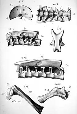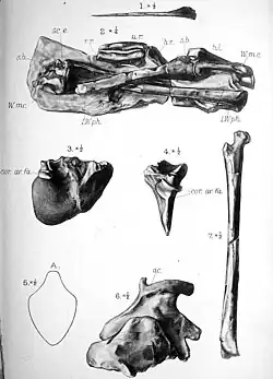 - ↑ Seeley, H. G., (1887), "On a sacrum apparently indicating a new type of bird, Ornithodesmus cluniculus Seeley from the Wealden of Brook", Quarterly Journal of the Geological Society of London 43: 206–211
