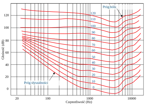Najniżej położona krzywa (0 fonów) stanowi próg słyszalności, czyli określa najmniejszą wartość poziomu ciśnienia akustycznego tonu o danej częstotliwości wywołującego wrażenie słuchowe. Krzywa położona najwyżej (około 130 fonów) to granica bólu, co oznacza, że tony o określonych przez nią poziomach powodują ból, a nawet mogą uszkodzić słuch. Pomiędzy krzywą progu słyszalności a krzywą granicy bólu leży cała rodzina krzywych izofonicznych, których parametrem jest poziom głośności[2].