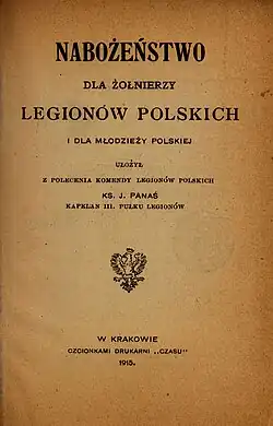 - ↑ J. Hulewicz, Panaś Józef, Polski Słownik Biograficzny, t. XXV, Wrocław-Warszawa-Kraków-Gdańsk, 1980. s. 113. W. Cygan, W. Wysocki, Dla ciebie, Polsko, krew i czyny moje: duszpasterstwo wojskowe Legionów Polskich, Warszawa 1997, s. 121.