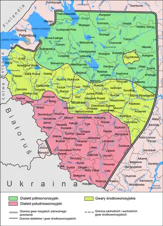 Wyróżnia się trzy grupy dialektów rosyjskich (patrz mapa po prawej):[12]