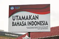 Funkcję języka urzędowego Indonezji pełni język indonezyjski[11]. Jest to krajowa odmiana (w szerszym ujęciu: grupa odmian) języka malajskiego[g], bliska pokrewnym formom malajskiego z Malezji, Brunei i Singapuru[92]. Indonezyjski odgrywa w Indonezji rolę języka wehikularnego (lingua franca), jest szerzony za pośrednictwem systemu edukacji i powszechnie używany w mediach masowych[11]. Według danych spisu ludności z 2020 r. włada nim ok. 97% mieszkańców kraju[93]. W największych ośrodkach miejskich, takich jak Dżakarta, Medan, Bandung i Surabaja, indonezyjski to często język kontaktów domowych, lecz w wielu innych zakątkach kraju przeważają w tej roli języki regionalne[94]. Nieco ponad 70% mieszkańców Indonezji posługuje się językiem lokalnym w domu lub w kontaktach z osobami z sąsiedztwa i rodziny[93].