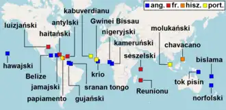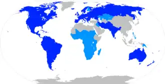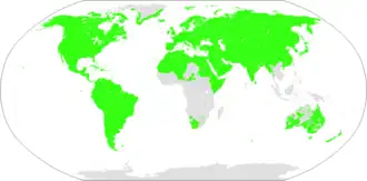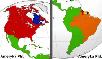 - w Ameryce – na przeważającym obszarze obu kontynentów amerykańskich (z wyjątkiem terenów autochtonicznych językowo[f]);