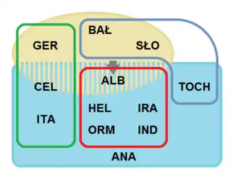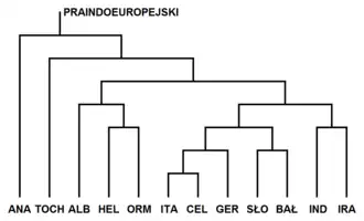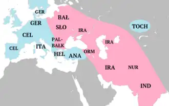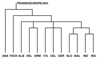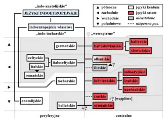 - nieanatolijska – obejmująca pozostałe grupy (określane łącznie jako indoeuropejskie właściwe[45], jądrowe[46], klasyczne[7] lub indo-tocharskie[47]).