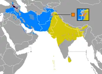 - w Azji – w większej części subkontynentu indyjskiego, w irańskojęzycznej części Bliskiego Wschodu, na niektórych obszarach azjatyckiej części Rosji, w Tadżykistanie, a także w niektórych rejonach Kaukazu;