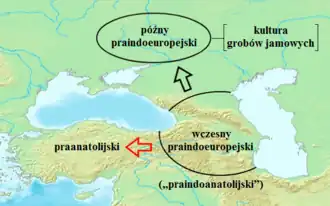 Wreszcie sama grupa języków anatolijskich przeciwstawiana jest wszystkim pozostałym – stanowi ona bowiem najbardziej odrębną gałąź całego drzewa filogenetycznego rodziny[42][43]. U jego podstaw są więc wyróżniane dwie pierwotne indoeuropejskie linie rozwojowe[44]: