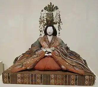 W okresie Edo wśród mieszczan rozpowszechnił się zwyczaj eksponowania lalek hina ningyō (jap. 雛人形) podczas Święta Dziewczynek, zwanego też Festiwalem Lalek. Chociaż już w latach 40. i 50. XVII wieku siogunat Tokugawów wydał prawa ograniczające ekstrawagancję i przepych w kostiumach lalek, od przełomu XVII i XVIII wieku niektóre typy figurek – genroku bina (jap. 元禄雛) i kyōho bina (jap. 享保雛) – odziewano w wielowarstwowe stroje[26]. Formy i kolorystyka tych szat były „mieszczańską fantazją na temat strojów noszonych na dworze cesarskim”[27]. Jednak w połowie XVIII wieku wykształcił się kolejny rodzaj lalek – yūsoku bina (jap. 有職雛) – które ubierano w szaty o wiele skromniejsze, ale będące kopiami autentycznych modeli jūnihitoe. Materiały na te wielowarstwowe ubranka były nawet sprzedawane wytwórcom lalek przez dostawców tekstyliów na dwór cesarski[28]. Ostatecznie przepych, ozdobność i fantazyjność niektórych szczegółów stroju wcześniejszych typów figurek została połączona z realizmem ubiorów dworskich. Fuzja tych elementów znalazła swój wyraz w kokin bina (jap. 古今雛). Lalki te stały się najbardziej popularne wśród warstw mieszczańskich w ostatnim stuleciu okresu Edo[29].