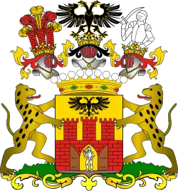 Herb z 1784: W polu złotym mury miejskie czerwone z trzema wieżami, środkowa nieco wyższa, brama w murach naturalna, otwarta, w niej rycerz srebrny z szablą wzniesioną do cięcia nad głową, murawa brązowo-szara. Nad tym głowica w której korona zamknięta na poduszce. Tarcza z bordiurą w trójkąty złoto-błękitne. Nad tarczą dwa hełmy z klejnotami. Klejnot I: godło z głowicy; klejnot II: pięć piór strusich, złotych między czerwonymi, na których trzy wieże czerwone. Wszystkie labry czerwone, podbite złotem.