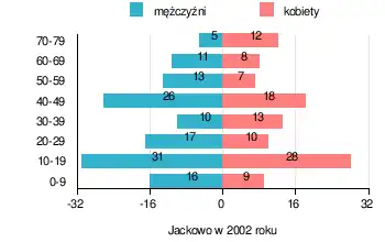 Współczesna struktura demograficzna osady Jackowo na podstawie danych z lat 1995–2009 według roczników GUS-u, z prezentacją danych z 2002 roku[6]: