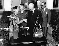 - ↑ Press release regarding Distinguished Service Medal awarded to Cochran. [w:] Jacqueline Cochran Papers, WASP Series, Box 13, Press Releases (3) [on-line]. Eisenhower Presidential Library, Museum & Boyhood Home, 1945-03-01. [dostęp 2016-09-20]. [zarchiwizowane z tego adresu (2016-12-24)]. (ang.).