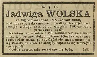 - ↑ Wizytacja kanoniczek, „Goniec Wieczorny. 1904, no 522” (522), crispa.uw.edu.pl, 14 października 1904 [dostęp 2024-01-21].