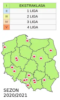 | Jagiellonia I | Ekstraklasa | I | 30 | 10 | 7 | 13 | 39 | 48 | -9 | 37 | 9 | I run. | ||