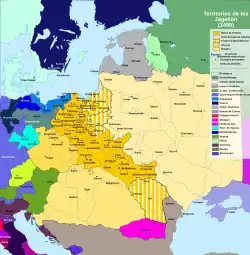 Wygaśnięcie linii męskiej Andegawenów wraz ze śmiercią Ludwika I Wielkiego 10 września 1382 roku rozpoczęło zmagania pomiędzy dynastiami o objęcie tronów w państwach pod dotychczasowym panowaniem wygasłej dynastii. Plan podziału władztwa króla Ludwika I tworzył dwa dynastyczne bloki krajów rozdzielone Karpatami – luksemburski obejmujący Polskę i Brandenburgię, przeznaczony margrabiemu Zygmuntowi Luksemburczykowi oraz Węgry i Austrię zjednoczone pod panowaniem księcia Wilhelma Habsburga[147][148][149]. Powołanie na tron Węgier starszej córki Ludwika, Marii, przez szlachtę węgierską 15 września 1382 roku obaliło te plany, a wybór Jagiełły na króla przez szlachtę polską wprowadził do dynastycznych zmagań nową dynastię – Jagiellonów[150][151]. Sława zwycięstwa grunwaldzkiego oraz atrakcyjna dla odmiennych kulturowo peryferyjnych prowincji Unii Jagiellońskiej tolerancyjna forma rządów Jagiełły w Polsce spowodowała zainteresowanie opozycji na Węgrzech i w krajach czeskich polskim władcą, jako potencjalnym konkurentem panujących Luksemburgów. Otwierało to drogę do wpływów Jagiełły i jego rodziny w krajach Europy Środkowej[152].