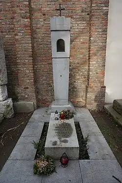 Spoczywa na cmentarzu Powązkowskim (Aleja Zasłużonych-1-54,55)[6].