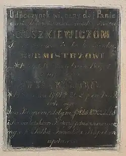 | Odpoczynek wieczny daj Panie a światłość wiekuista niechaj świeci GUSZKIEWICZOM Tomaszowi miasteczka Krościenka BURMISTRZOWI ∗ 1764 †.18.Kwietnia 1857 r. i jego żonie EWIE z WÓJCIKÓW ∗ 17.Grudnia 1791. † 21. Lipca 1849. ich syn: Jan. Krzyżem: złotym „piis meriti” i Kawalerskim Korony prus. zaszczyco ny, c.k. Pułku Inwalida Kapelan uprasza. |