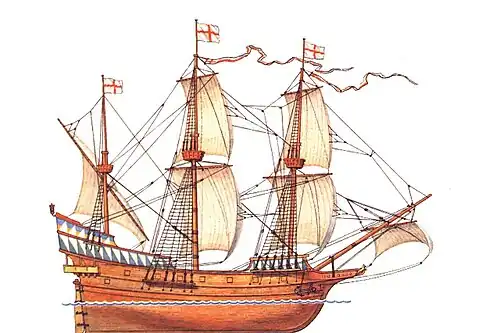 Został on wybudowany w Elblągu w 1570 roku przez Wincentego Skórę. Tak autor opisuje wygląd okrętu w drugiej części trylogii pt. "Czerwone krzyże"[2]: