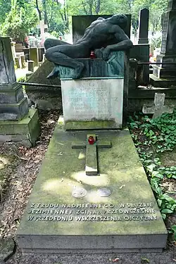 Pochowano go na cmentarzu Powązkowskim w Warszawie (kwatera 195., rząd 3., grób 10.)[8]. W 1926 roku na jego grobie wystawiono rzeźbę Peowiaka pt. „Walka” autorstwa Edwarda Wittiga[9]: umierającego nagiego wojownika z opadającą do tyłu głową trzymającego w lewej dłoni krótki miecz. Figura „Umierającego bohatera" będąca fragmentem rzeźby „Walka" na tym grobie stała się pierwowzorem Pomnika Poległych Żołnierzy Polskiej Organizacji Wojskowej odsłoniętego na Placu Małachowskiego w Warszawie w 1933 roku i ponownie w 1999 roku.