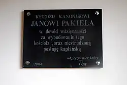 W kaplicy w Lipie znajduje się tablica mu poświęcona w podziękowaniu za budowę świątyni. Odsłonięto ją w 2006[4].