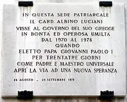 - ↑ Kongregacja Spraw Kanonizacyjnych: SOLENNE APERTURA DELLA CAUSA DI CANONIZZAZIONE DEL SERVO DI DIO ALBINO LUCIANI, PAPA GIOVANNI PAOLO I. www.vatican.va, 2003-11-23. [dostęp 2021-04-09]. [zarchiwizowane z tego adresu]. (wł.).