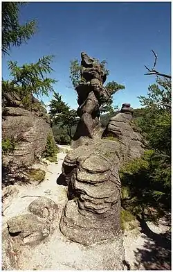 - Skalny Most – jedna z najpiękniejszych i najoryginalniejszych skał Rudaw Janowickich, wznosząca się w górnej części Zamkowego Grzbietu. Ma postać muru skalnego o długości ok. 30 m, zbudowanego z granitów waryscyjskich z żyłą aplitów. Jego północne przedłużenie stanowi wolno stojąca iglica skalna o wysokości 20 m, na wysokości ok. 17 m połączona z resztą masywu naturalnym mostem skalnym, na którym rośnie sosna. Szczelina pod mostem zwęża się do ok. 1 m, a pod nią przebiega jeszcze stromy tunel skalny. U podstawy iglicy skalnej w ścianie umieszczona jest kopia brązowej tablicy z 1931 r., upamiętniającej śmierć wspinacza Waltera Tuffecka z kamiennogórskiego koła Turnvereinu;