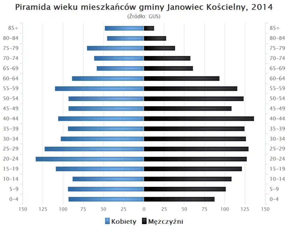 - Piramida wieku mieszkańców gminy Janowiec Kościelny w 2014 roku[1].
