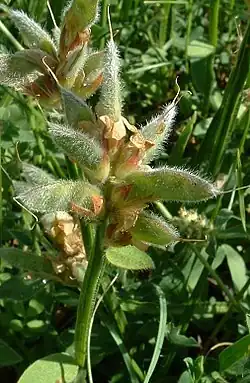 - Strąki płaskie z wypukłościami nad nasionami. Są przylegająco owłosione i osiągają do 20 mm długości przy 5 mm szerokości[5].