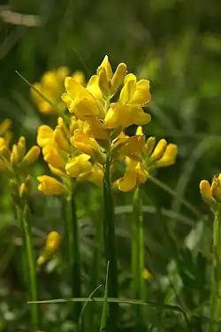 - Zebrane po 4–20 w zbite, kulistawe do jajowatych grona na szczytach gałązek. Oś kwiatostanu, szypułki (długości do 3 mm) i kielichy gęsto owłosione. Kwiaty wsparte wąskimi przysadkami o długości do 5,5 mm. Na szypułkach znajduje się także para szydlastych podkwiatków o długości do 3,5 mm. Kielich dwuwargowy, o długości do 9 mm. Korona kwiatu żółta o budowie typowej dla kwiatu motylkowego. Żagielek odwrotnie jajowaty, na szczycie wycięty. Wszystkie płatki równej długości[5].