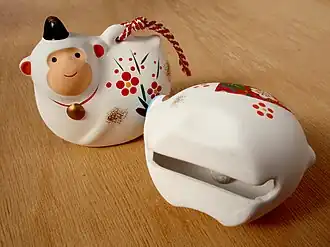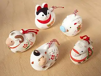 Ceramiczne dzwonki o charakterze zabawki, pamiątki, amuletu o rozmaitych kształtach (np. zwierząt chińskiego zodiaku) z umieszczonymi wewnątrz kulkami również z ceramiki i szczeliną, przez którą dochodzi ich dźwięk[4].