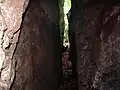 Główny otwór jaskini znajduje się w pionowej rozpadlinie rozcinającej skałki przy 5 przystanku ścieżki dydaktycznej „Góra Stołowa”. Ma wysokość do 16 m i szerokość około 1 m. Początkowa część korytarza ma pionowe ściany i nie posiada stropu. Pod stropem korytarz ostro skręca, a jego ściany pochylają się. Zaklinowane w szczelinie skały dzielą go na dwa poziomy; górny i dolny. W dolnej części korytarz początkowo opada w dół i staje się coraz wyższy, potem podnosi się do góry i kończy w zawalisku. Do górnego poziomu można wejść trójkątnym otworem znajdującym się w zawalisku na wysokości górnego stropu jaskini. Poprzez 1,5 metrowej wysokości próg można dostać się do komory o równym dnie z naturalnym stropem z otworami. Północna część jej ściany jest pochylona[1].