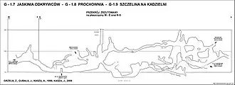 - ciąg nazwany Wielka Szczelina prowadzący do Sali Górnej. Jest tu korytarzyk prowadzący do Prochowni