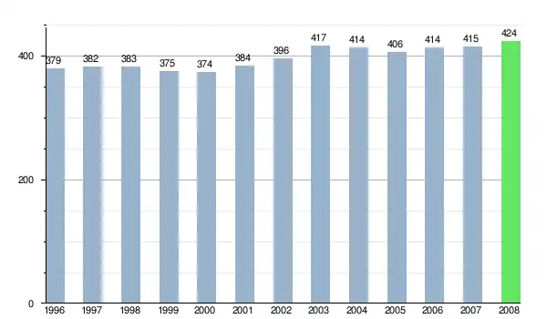 Zmiany liczby ludności w miejscowości Jastrabie nad Topľou od 1996 roku[8].