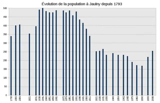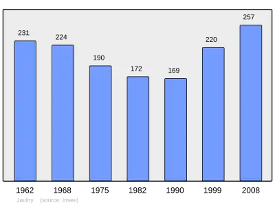 Według danych na rok 1990 gminę zamieszkiwało 169 osób, a gęstość zaludnienia wynosiła 20 osób/km² (wśród 2335 gmin Lotaryngii Jaulny plasuje się na 876. miejscu pod względem liczby ludności, natomiast pod względem powierzchni na miejscu 712.).