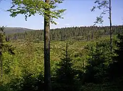 ![]() Szczyt Jawornickiej Kopy widziany z Drogi Marianny. Po lewej Dukt Nad Spławami, po prawej droga na szczyt | |
