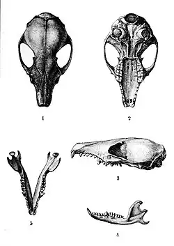 Czaszka może być różnie zbudowana. Niekiedy wąska i wydłużona, gdzie indziej krótka a szeroka. Mózgoczaszka jest niewielka. Kość bębenkowa niekompletna. Potylicę ma płaską bądź wklęsłą. Łuki jarzmowe są dobrze rozwinięte[5].