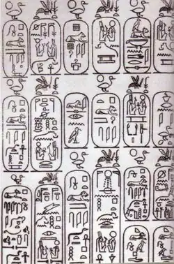 - ↑ Jean-François Champollion, Précis du système hiéroglyphique des anciens Égyptiens, ou Recherches sur les éléments premiers de cette écriture sacrée, sur leurs diverses combinaisons, et sur les rapports de ce système avec les autres méthodes graphiques égyptiennes. [3], wyd. Seconde édition, augmentée de la lettre à M. Dacier relative à l'alphabet des hiéroglyphes phonétiques employés par les Égyptiens sur leurs monumens de l’époque grecque et de l’époque romaine., Paris: wydawca nieznany, [1828].