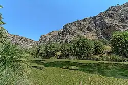 Rośliny jednoliścienne: daktylowce nad brzegami i rdestnica nawodna w rzece
