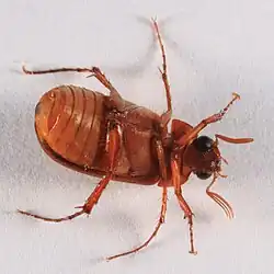 Chrząszcz o wydłużonym, dość słabo wypukłym ciele długości od 8 do 10 mm, ubarwionym jednolicie rdzawobrunatnie. Na spodzie ciała, pygidium oraz bocznych krawędziach przedplecza i pokryw wyrastają stosunkowo długie, jasne włoski, a na wierzchu pokryw rzadko rozmieszczone, krótkie, łamliwe szczecinki. Czułki są zbudowane z dziewięciu członów – u samca o buławce dłuższej, a u samicy krótszej niż pozostałe człony razem wzięte. U samca oczy są bardzo duże i wyłupiaste, u samicy – mniejsze i słabiej sklepione. Dwukrotnie szersze niż dłuższe przedplecze ma obrzeżone krawędzie przednią i boczne, nieobrzeżoną zaś krawędź tylną. Pokrywy rozszerzają się nieco ku tyłowi. Mają po dziesięć punktowanych rzędów i słabo wypukłe międzyrzędy z rozproszonym i płytkim punktowaniem. Odnóża zwieńczone są długimi i cienkimi stopami o rozszczepionych pazurkach[4].