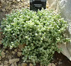 - Bylina gruboszowata ze zdrewniałą łodygą, płożąc się tworzy kępy o średnicy 40–100 cm. Pędy są kruche, wyprostowane lub zwisające[5][7], osiągające do 0,25 m wysokości[6]. Kora ma barwę od ciemnobrązowej do czarniawej, łuszczy się i jest wzdłużnie popękana. Starsze gałęzie są gołe do dwóch trzecich ich długości i mogą dorastać do 70 mm długości. Młode gałęzie mają gąbczaste międzywęźla osiągające 5-10 mm długości i 5 mm średnicy, początkowo mają brązowawą barwę, często przyczepione są do nich stare, opadnięte liście. Korzenie są włókniste[5][7].