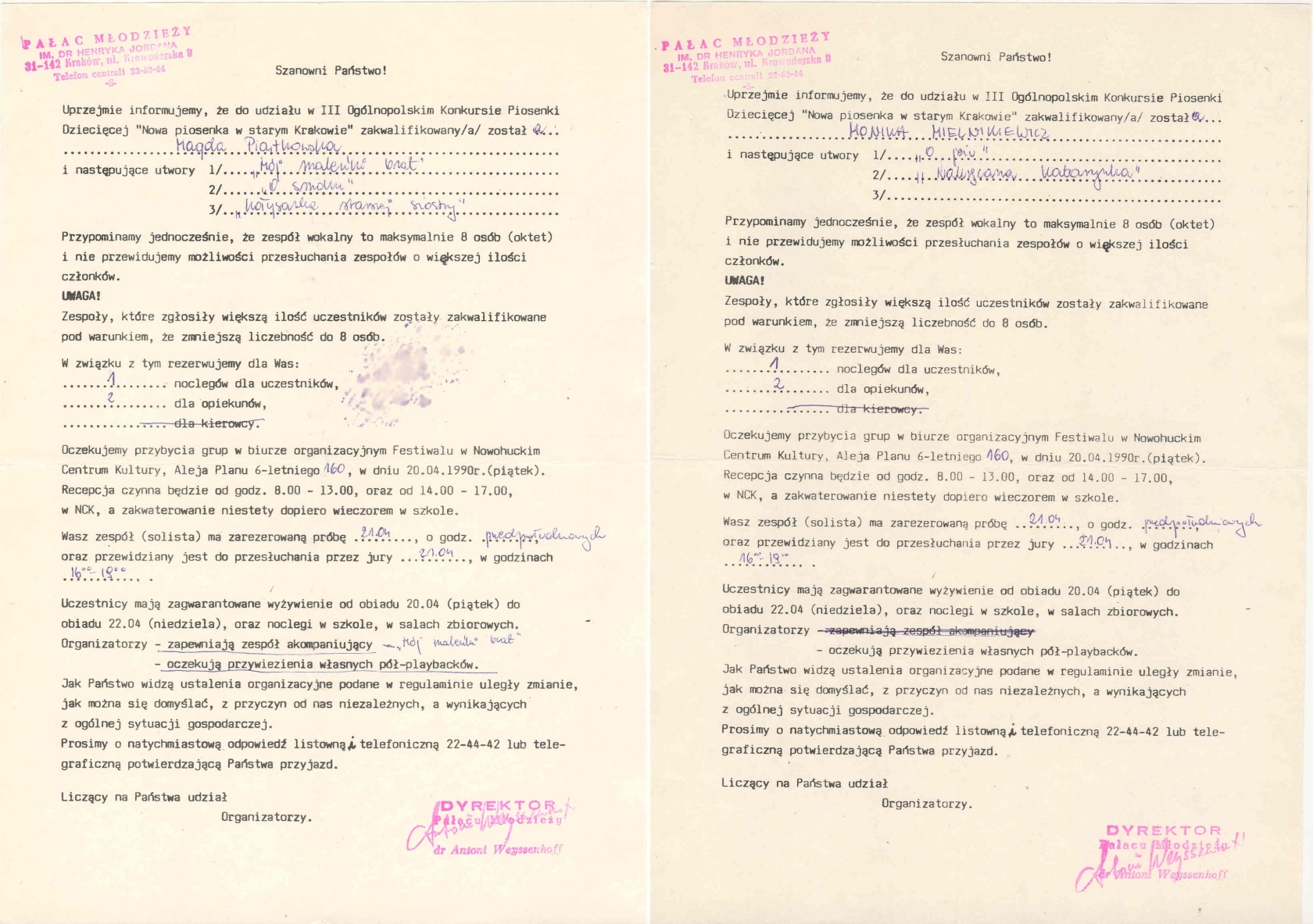 - ↑ Pisma dyrektora Pałacu Młodzieży w Krakowie, informujące o zakwalifikowaniu do udziału w III Ogólnopolskim Konkursie Piosenki Dziecięcej „Nowa Piosenka w Starym Krakowie” dwóch solistek z Ogniska Pracy Pozaszkolnej przy Szkole Podstawowej we Wrocławiu.