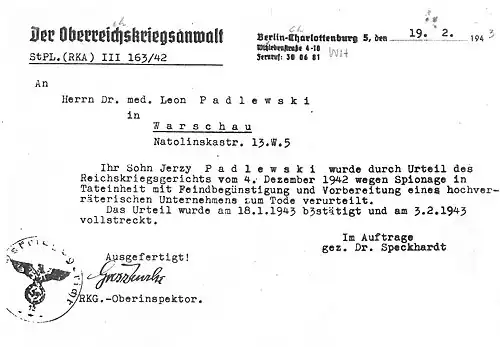 Jerzy Padlewski został przewieziony 27 stycznia 1943 z więzienia Moabit do celi śmierci więzienia Brandenburg Görden[22]. Stracony na gilotynie 3 lutego 1943. Niektóre źródła podają, że został ścięty toporem. Nieporozumienie wynika z błędnego tłumaczenia – Fallbeil (dosłownie: opadający topór) to niemieckie określenie gilotyny[23]. Ciało poddano kremacji. Prochy zostały umieszczone na cmentarzu Hauptfriedhof Görden[24].