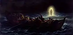- uczniowie znajdują się na wodzie jeziora wieczorową porą (Mt 14,24; Mk 6,47; J 6,17);