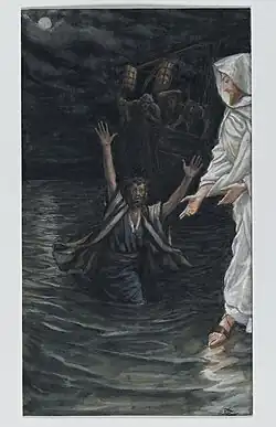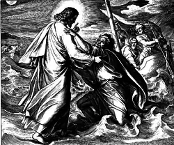 | 28Na to odezwał się Piotr: «Panie, jeśli to Ty jesteś, każ mi przyjść do siebie po wodzie!» 29A On rzekł: «Przyjdź!» Piotr wyszedł z łodzi, i krocząc po wodzie, przyszedł do Jezusa. 30Lecz na widok silnego wiatru uląkł się i gdy zaczął tonąć, krzyknął: «Panie, ratuj mnie!» 31Jezus natychmiast wyciągnął rękę i chwycił go, mówiąc: «Czemu zwątpiłeś, małej wiary?». | ||