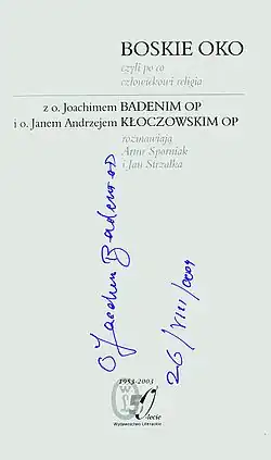 - Boskie oko, czyli po co człowiekowi religia. Z o. Joachimem Badenim i o. Janem Andrzejem Kłoczowskim rozmawiają Artur Sporniak i Jan Strzałka, Kraków: Wydawnictwo Literackie, 2003, ISBN 83-08-03522-1.
