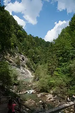 Pierwotnie rzeka opuszczała płaskowyż Charmey, pokonując na odcinku niespełna 2 km różnicę poziomów ok. 100 m, głęboko wciętym w skały wąwozem (fr. Gorges de la Jogne). Po wybudowaniu w 1920 r. zapory Montsalvens rzeka Jogne uchodzi w Charmey do jeziora Montsalvens. Jej wody opuszczają jezioro wykutą w skałach sztolnią i napędzają turbiny elektrowni wodnej w Broc, a dawnym korytem w wąwozie spływają jedynie zrzuty nadmiaru wód ze zbiornika.