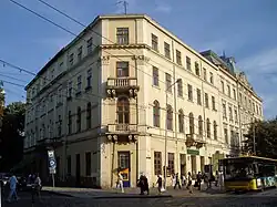 - Czynszowa kamienica F. Adamskiego u zbiegu Prospektu Swobody 24 (Wały Hetmańskie) i Łesi Ukrainki (Skarbkowska);