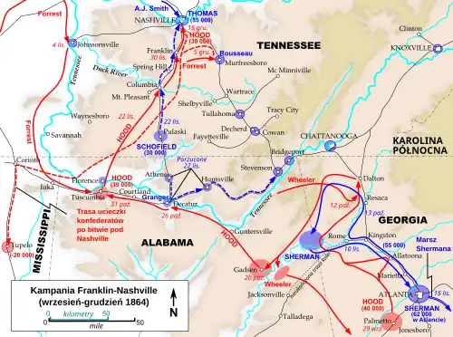 Podczas gdy Sherman przegrupowywał wojska pod miastem, szykując się do marszu ku morzu, Hood i Davis obmyślali strategię, jak go pokonać. Zamierzali uderzyć na linie komunikacyjne północy pomiędzy Chattanoogą a Atlantą, przejść się przez Alabamę w kierunku centralnego Tennessee i Kentucky, następnie przez przełęcz Cumberland, by przyjść w sukurs oblężonemu w Petersburgu Robertowi Lee. Sherman nie chciał jednak kooperować. Miast ścigać uchodzące siły Hooda całą armią, posłał gen. dyw. George’a Thomasa do Tennessee, celem przygotowania na uderzenie Hooda, sam zaś ruszył z większością wojsk w kierunku Savannah.