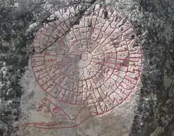 - ↑ Kamienie runiczne występują w miejscach, które znajdowały się pod wpływem kultury nordyckiej. Wąż był jednym z typowych rysunków (zob. np. Runestone U 240, Vallentuna). Większość napisów upamiętniała faktycznie istniejące osoby (DR 297): Osbern, towarzysz Tokego, wzniósł ten kamień po śmierci Tokego, swego brata. Napis Wolleya (przedstawiciela wiktoriańskiej Anglii), brzmi w wersji angielsko-szwedzkiej[25]: , a w swobodnym tłumaczeniu na język fiński[25]: