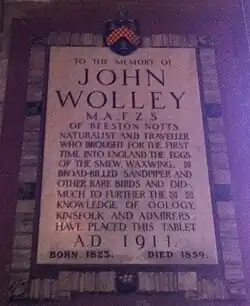 - ↑ J. Wolley rozchorował się poważnie w czasie wyprawy do Islandii. Przebywał wówczas w pobliżu wysp Eldey i Geirfuglasker („Great Auk Rock”, zob. alka olbrzymia), niedaleko Reykjavíku. W ostatniej fazie choroby znajdował się pod opieką londyńskiego specjalisty, dr. Todda. Zgodnie z wolą zmarłego jego szczątki przewieziono do Matlock i pochowano w Katedrze w Southwell[1].