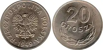 - 20 groszy wzór 1957 (kontynuowany do 1985 r.),