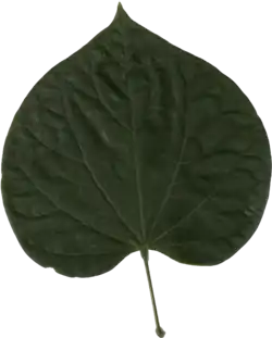 - Sercowate, zaokrąglone, całobrzegie do 10 cm długości i 13 cm szerokości. Początkowo brązowozielone, po rozwinięciu zmieniają barwę na jasnozieloną. Jesienią żółkną i przybierają złocisty kolor. Blaszki gładkie i bardzo cienkie[5].